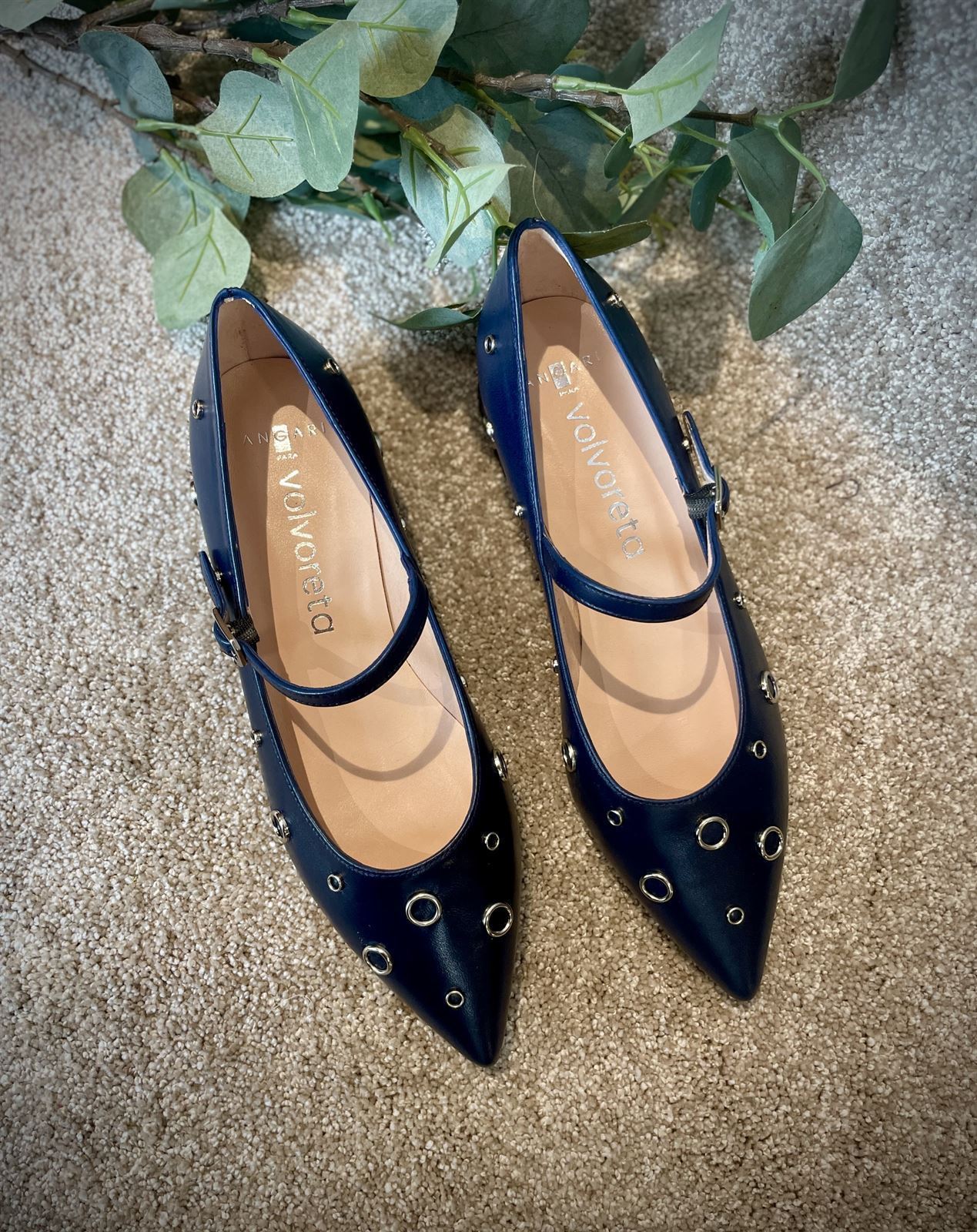 Bailarina Manoletina en piel de lo más blandita en color azul marino, con adorno de tachas aretes doradas.