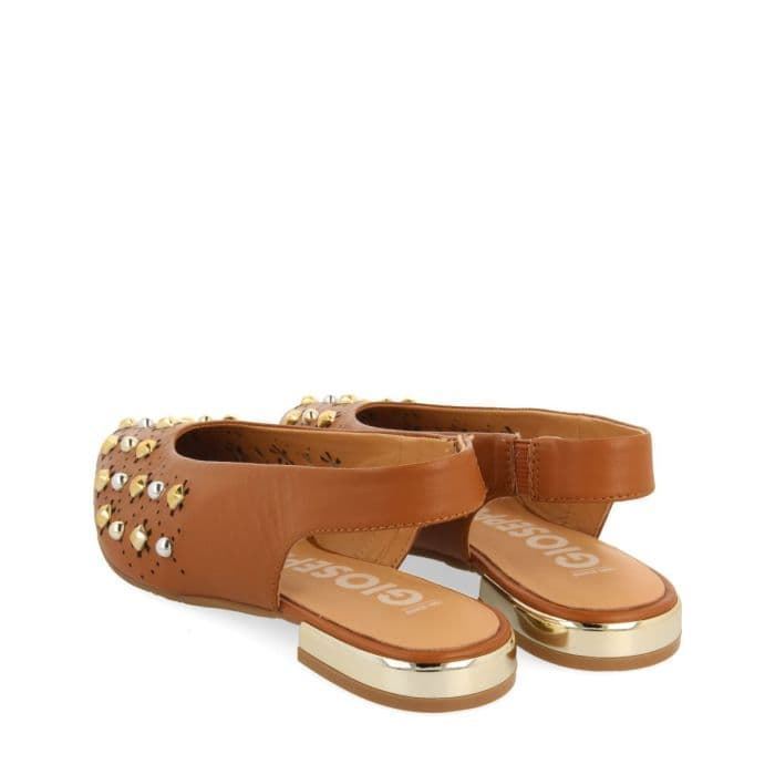 MANOLETINAS DESTALONADAS EN PIEL COLOR CUERO CON DETALLE DE TACHAS.. Cómoda y estilosa Bailarina de la firma española GIOSEPPO en piel color camel con tachas, manoletina destalonada perfecta para esta primavera verano.