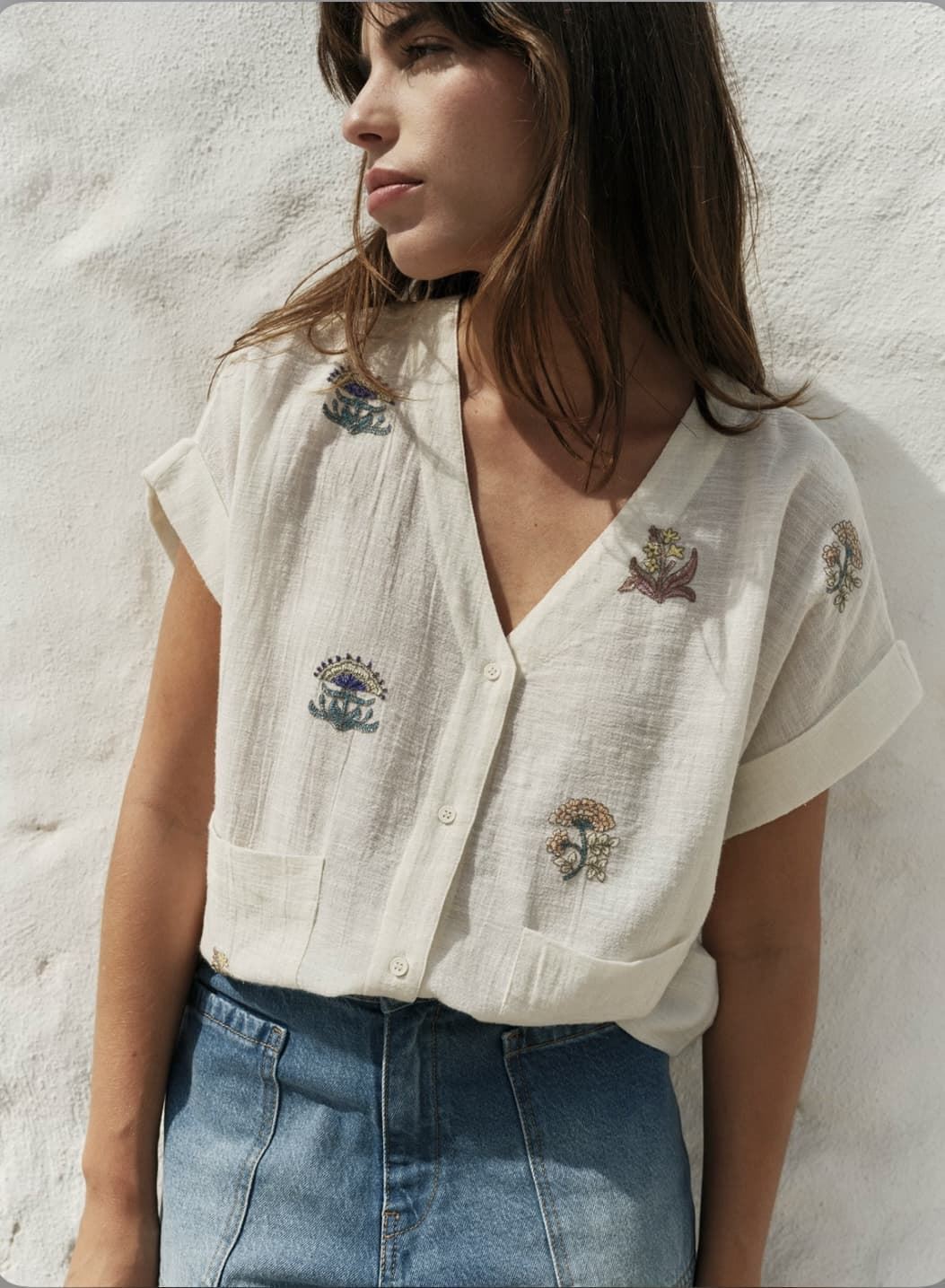 Esta camisa de bordados florales sobre gasa de algodón orgánico, tiene hombro caído y un fit cuadrado que nos encanta.