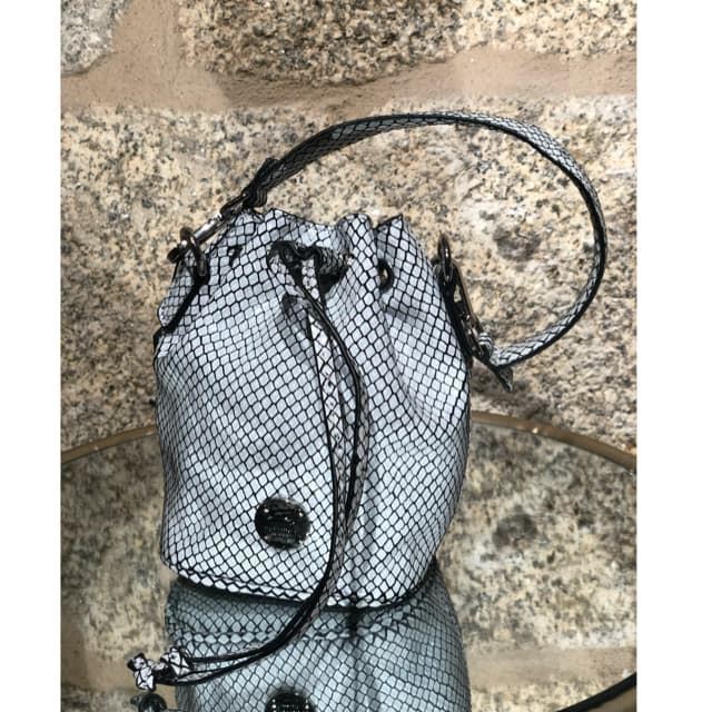 Saquito metalizado blanco, snake, doble asa. Cierre ajustable tipo judas. Dos posiciones, asa corta de mano y asa larga tipo bandolera.