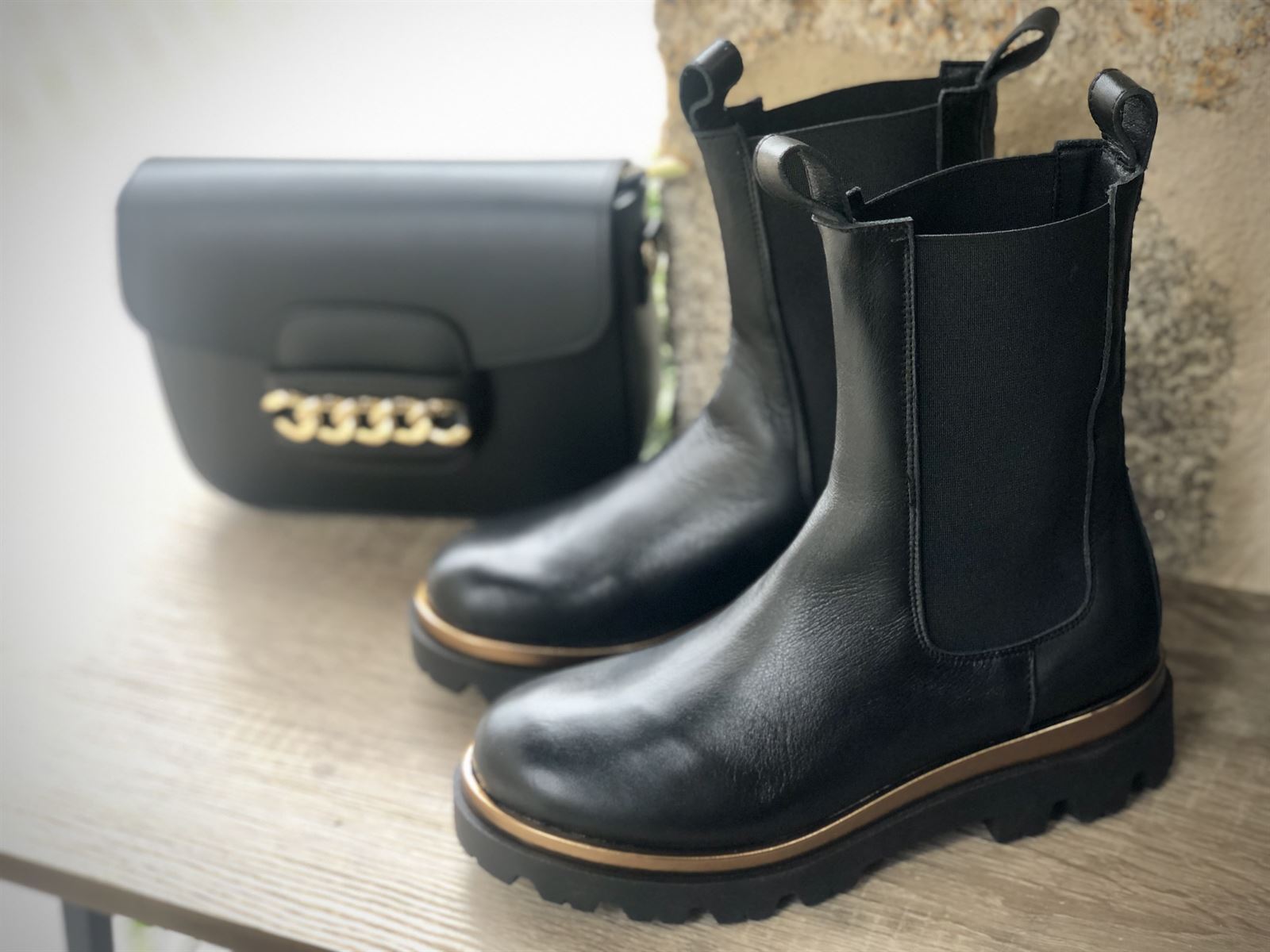 Las botas con acento británico, que año tras año se han convertido en las protagonistas del street style. Las Chelsea Boots se caracterizan por su largo hasta el tobillo, suela de goma y elástico los laterales. detalle en el piso de tira dorada a contraste