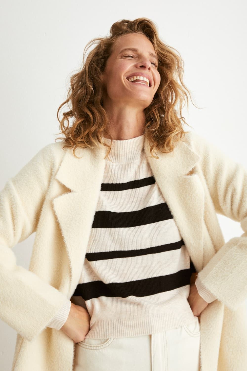 Chaqueta corta tipo abrigo. Tejido punto efecto pelo. Calidad confortable y ligera. Cuello solapa. Manga larga. Doble botonadura frontal. Sin forro. Fittingrecto, volumen cuadrado.