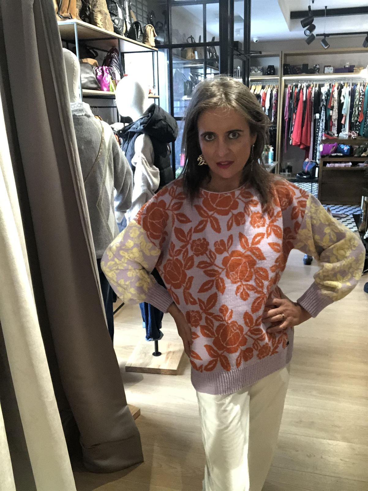 Jersey estampado en tonos pastel, predominando el Lila clarito, con mangas abullonadas. De corte flojito.
