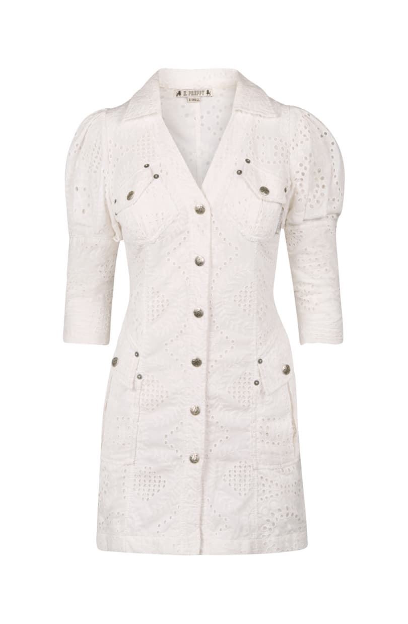 Vestido bordado algodón blanco, romántico y versátil. Escote pico, cuellos camiseros y manga francesa. Cierro delantero con botones metálicos. Bolsillos con solapas y cierre botón.