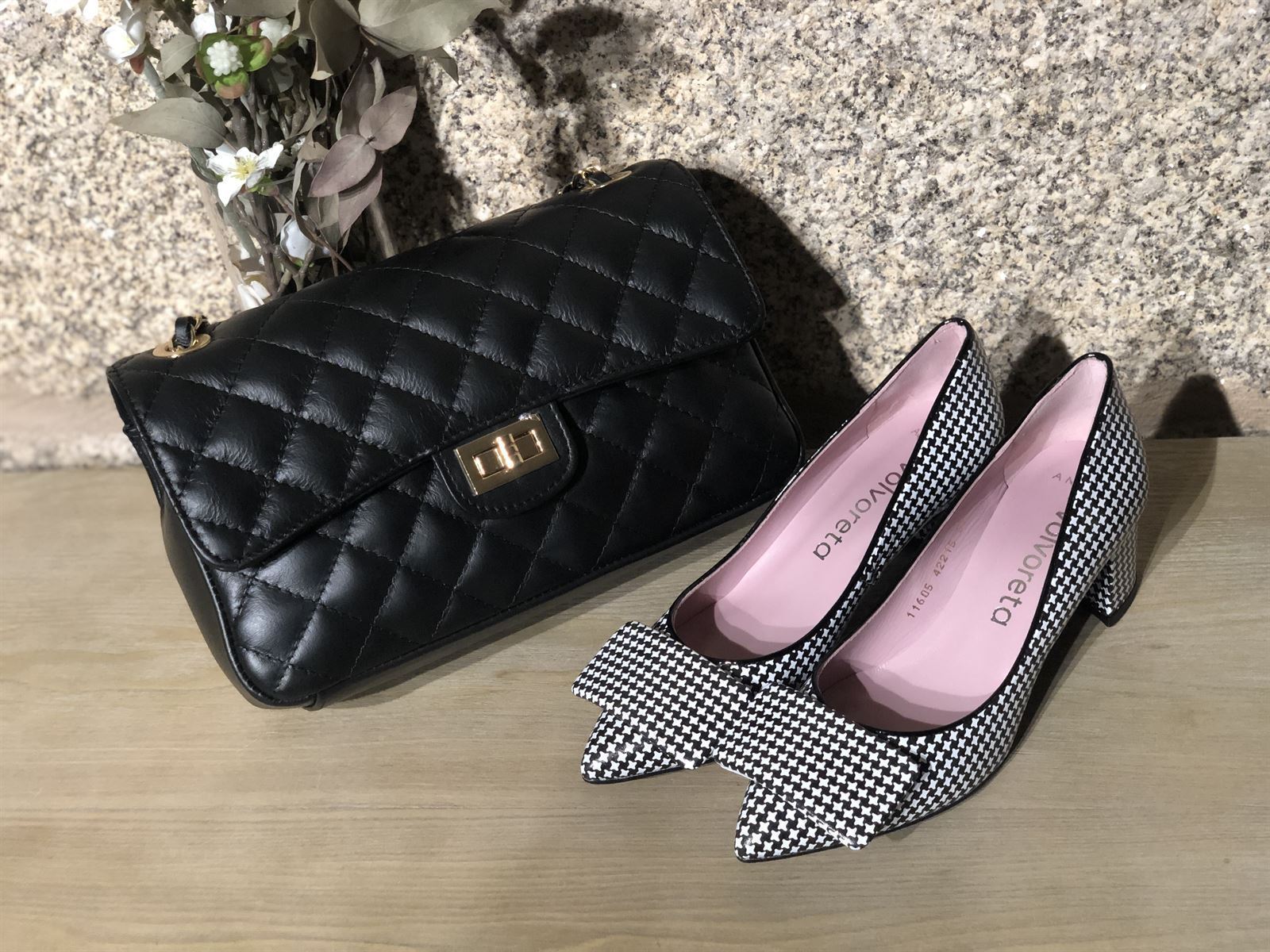 Bonito zapato bicolor de piel estampada pata gallo. Suela antideslizante con plantilla de gel para mayor comodidad, forrado en piel.