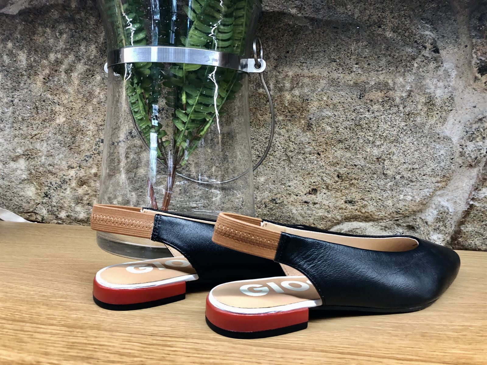 Este modelo te va a encantar. Bailarina destalonado en piel de color negro y detalle de elástico trasero forrado en cuero. Tacón naranja de 1,5 cm. El modelo perfecto está en Gioseppo.